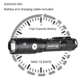 Par rapport aux autres lampes torches du même type, la Soonfire MX65 offre une bonne performance en matière d’autonomie. A pleine puissance (1.000 lumens), la lampe tient pendant une bonne heure. En mode basse consommation, elle est annoncée par le constructeur pour tenir plus de 300 heures. On n’a pas fait le test de la laisser allumée pendant 13 jours mais bon, sachez qu’elle a une bonne autonomie, sur plusieurs jours.